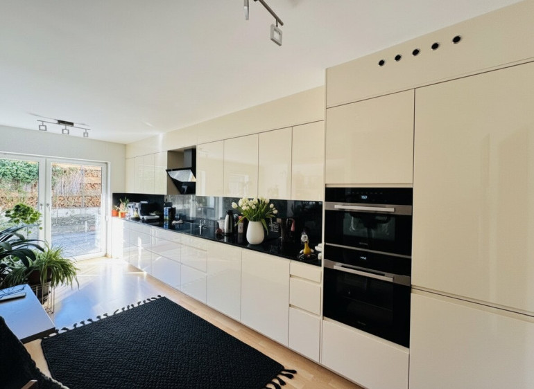 Ein Highlight ist die hochwertige, moderne DAN-Küche mit Miele-Geräten, robuster Granit-Arbeitsplatte und eleganter Granit-Rückwand. Durchdachtes Design trifft hier auf optimale Funktionalität: Viel Stauraum und großzügige Arbeitsflächen machen die Küche perfekt für Kochbegeisterte. (Küchenpreis: € 38.000, bereits im Kaufpreis enthalten.)