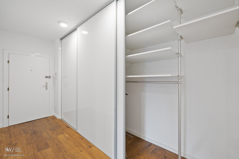 Ein zentrales Vorzimmer mit raumhohem, maßgefertigtem Schrank bietet viel Platz und schafft eine angenehme, offene Atmosphäre.