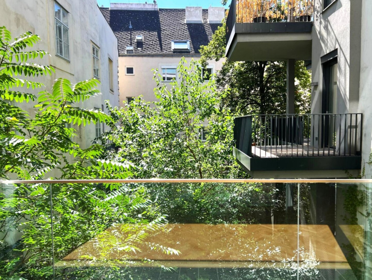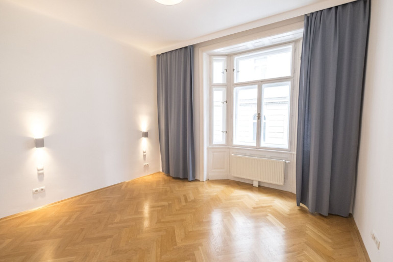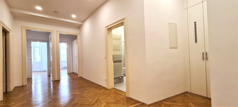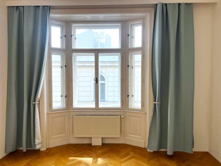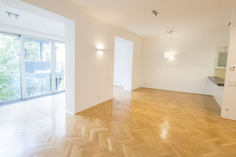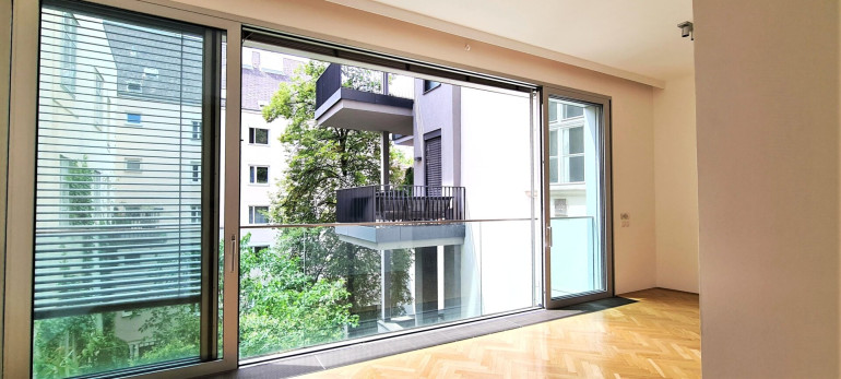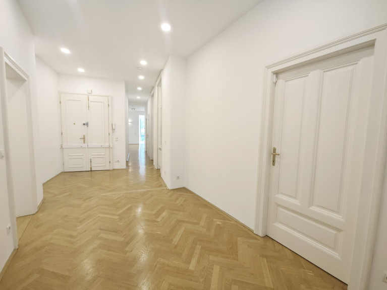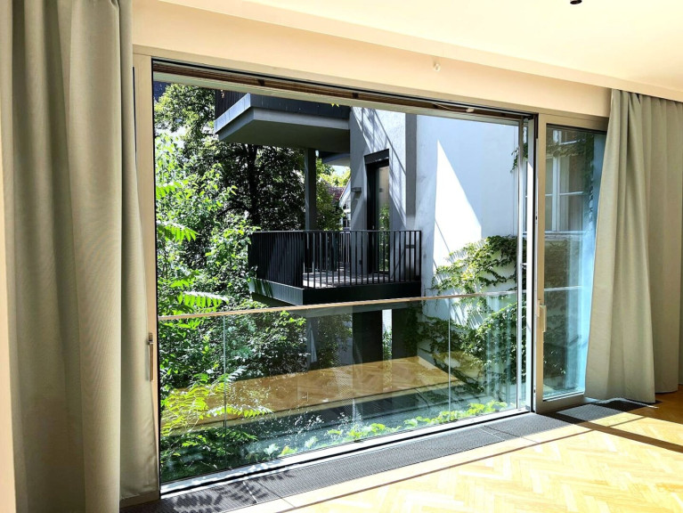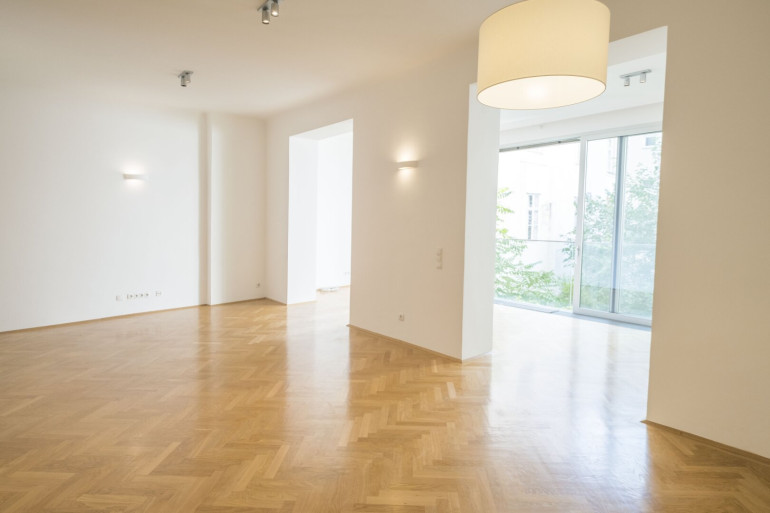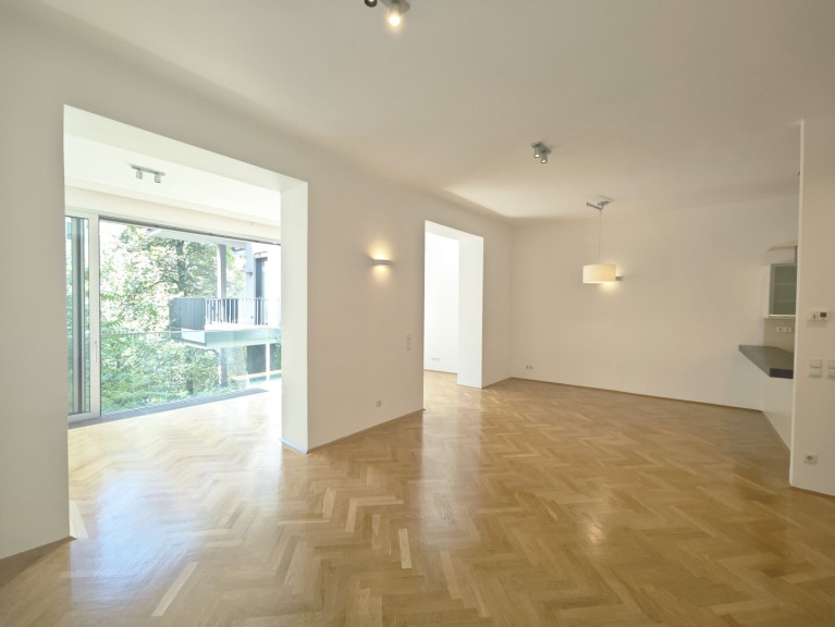 Die ca. 154 m2 große 4-Zimmer-Wohnung wurde 2021 renoviert (Bäder, WC, .....). Das Wohnzimmer hat quasi einen integrierten "Loggia"-Teil, also in jener Erweiterung, die im Rahmen der Hausrenovierung zum begrünten Innenhof hin hergestellt wurde. Die Wand-zu-Wand und Decken-zu-Boden Fensterfront kann in Segmenten bis zu 2/3 der Fläche geöffnet werden. Dies Feature verleiht ein Wohngefühl, wie es in einem historischen Haus normalerweise kaum vorzufinden ist. Es gibt 3 Schlafzimmer (1 mit en-suite-Bad und Garderobenschrank im Zugangsbereich, 1 mit begehbarem Schrankraum neben dem Zugangsbereich), 2 Bäder, 3 WCs (davon 1 separates WC), Küche (offen zum Essbereich im Wohnzimmer) separater Wirtschaftsraum mit Waschmaschine und Wäschetrockner. Unmöbliert (ausser Küche, Schrankraum und Einbauschrank zum 2. Schlafzimmer). Ein Kellerabteil ist vorhanden, jedoch nicht für alle Lagerungen geeignet.