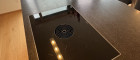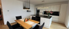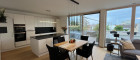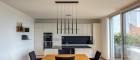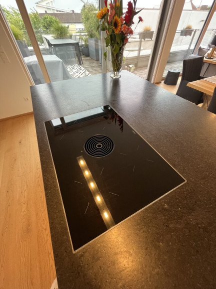 Offene Küche mit Inselblock und Essbereich. Tischler-Einbauküche mit high-end Markengeräten. Voll ausgestattet mit Töpfen, Pfannen, Geschirr, Utensilien, Gläsern, Besteck.
