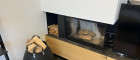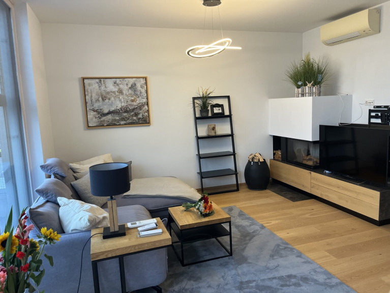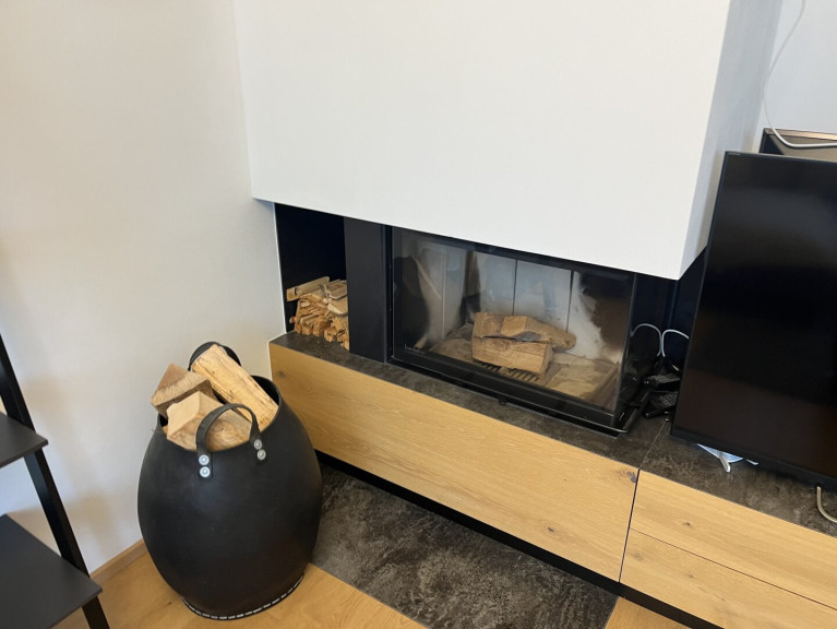 Großzügiges Wohnzimmer mit gemütlichem Heizkamin und direktem Zugang zur 26m2 großen Terrasse.