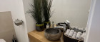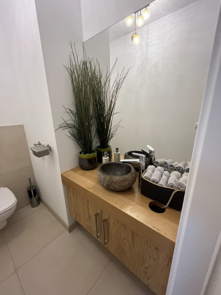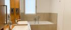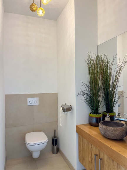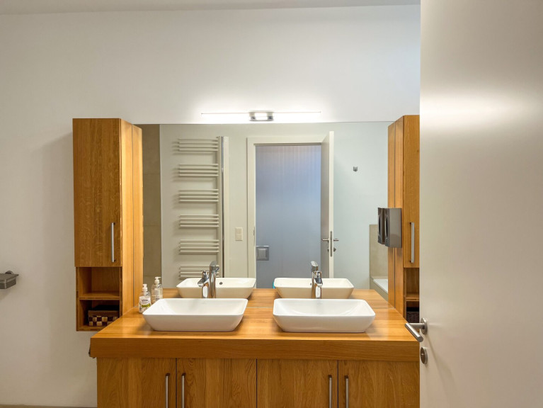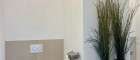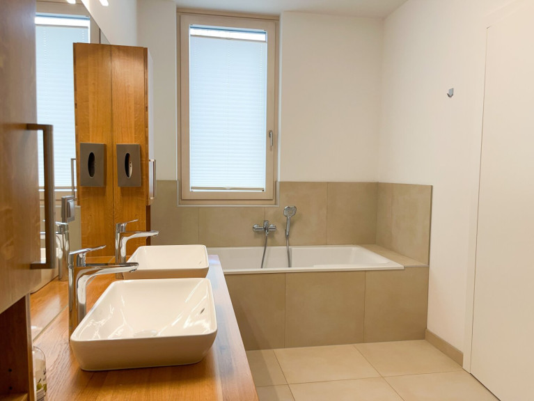 Luxuriöses Badezimmer mit Badewanne, barrierefreier Dusche und Dusch-WC. Separates Gäste-WC.
