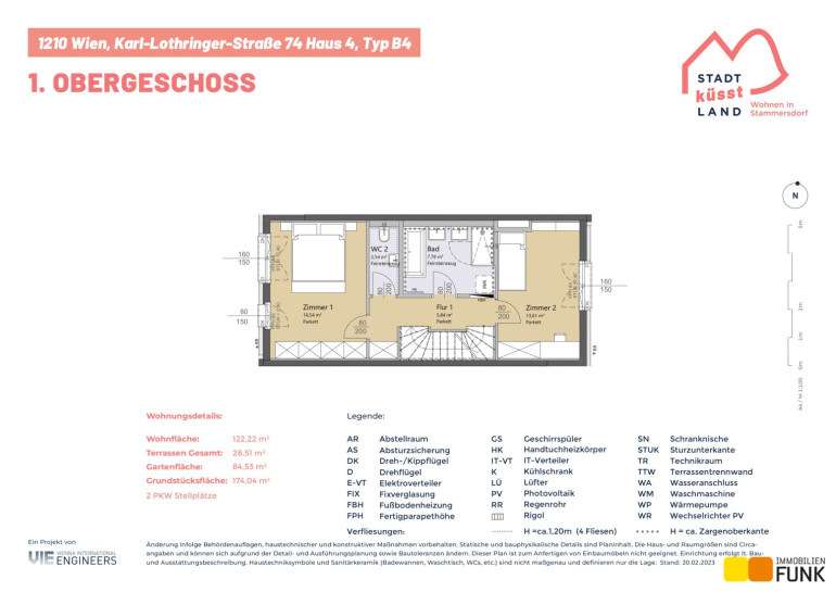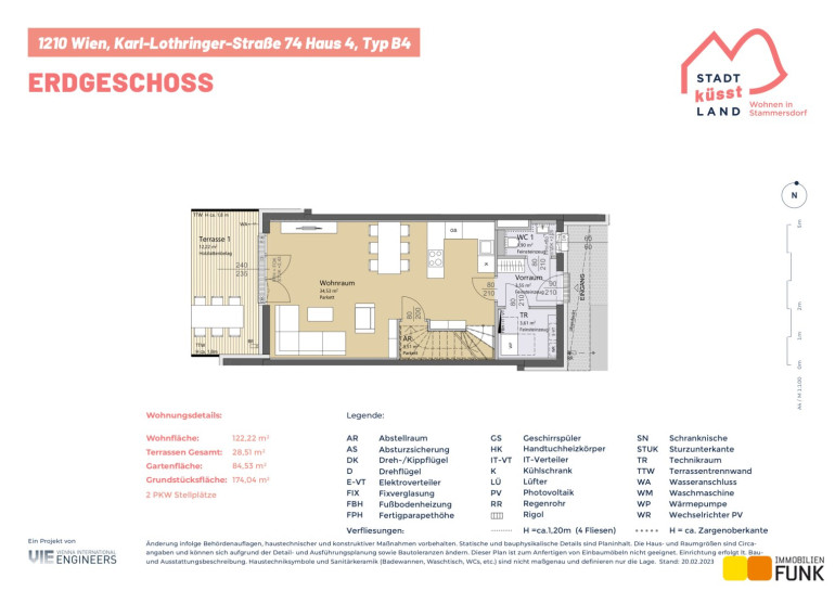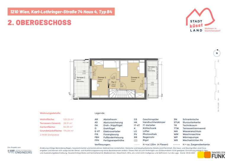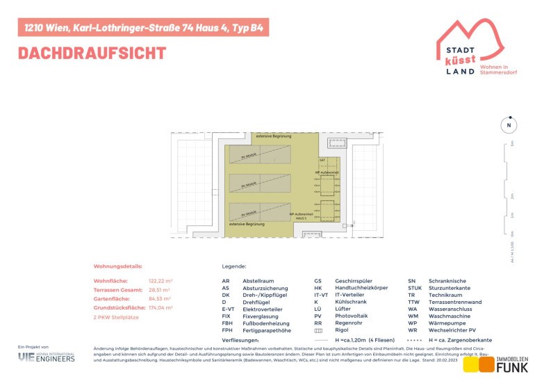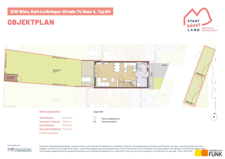 Das Reihenhaus 4 wird auf einem ca. 174 m² großen Eigengrund errichtet. Seinen künftigen Bewohnern bietet es zudem eine komfortable Wohnfläche im Ausmaß von insgesamt ca. 122 m², angeordnet auf drei Geschoßen mit 5 Zimmern, 2 Toiletten, einem großen Badezimmer, dem Technikraum und einem Abstellraum, sowie einer westseitig ausgerichteten Terrasse mit ca. 12 m², die sich zu einem weitläufigen Gartenbereich mit ca. 84 m² öffnet. Im Dachgeschoß befinden sich zudem zwei Dachterrassen mit ca. 9 m² und 6 m². Diesem Reihenhaus sind zwei Parkplätze in unmittelbarer Nähe zugewiesen. Der Kaufpreis für den KFZ-Platz 1 beträgt 19.000,00 €, und jener für den zweiten KFZ-Stellplatz 13.000,00 €.