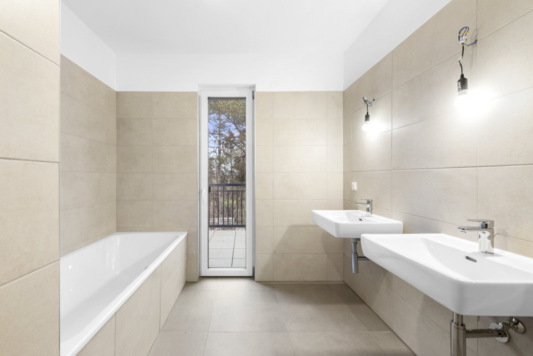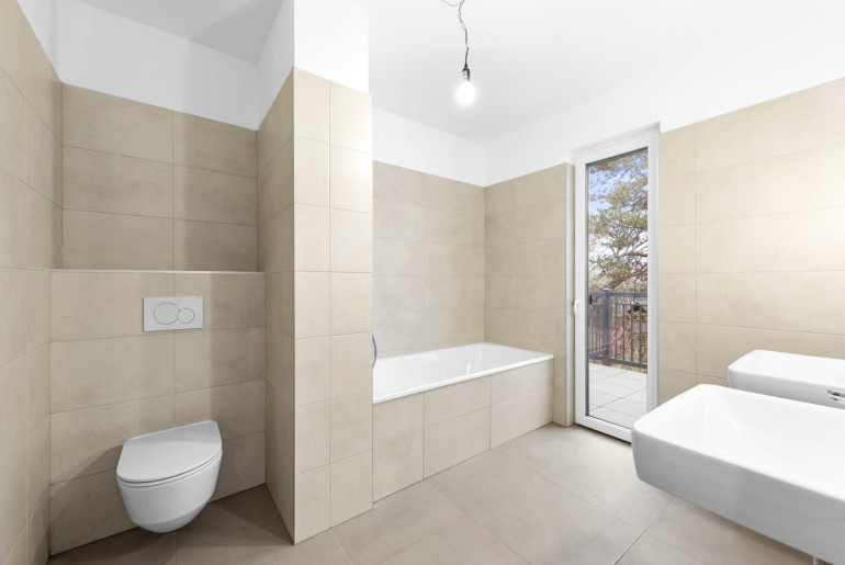 Badezimmer mit WC, Badewanne und Doppelwaschtisch