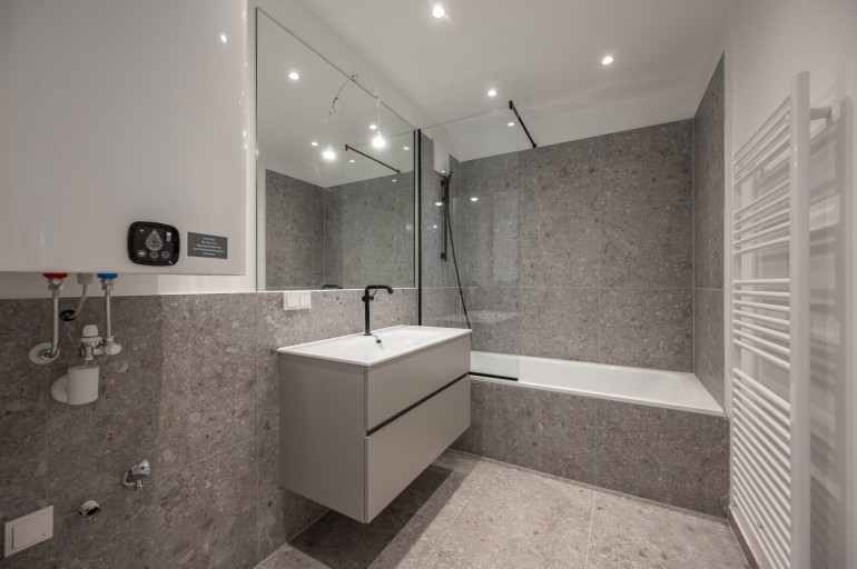 Estrichboden, Fliesen, Parkett, Fußbodenheizung, Einbauküche, Personenaufzug, Ostbalkon, Westbalkon, Badewanne, Garage