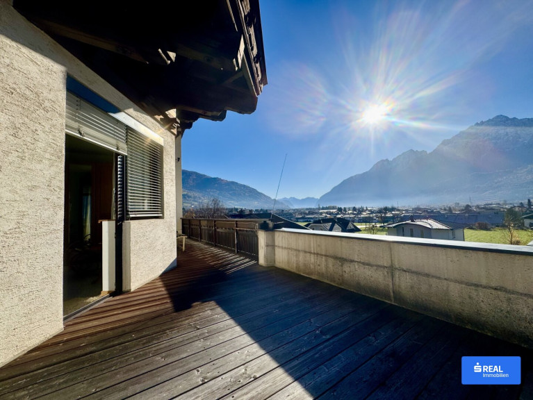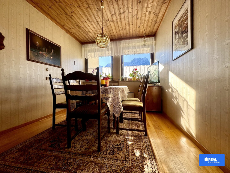 Im Erdgeschoss erwarten Sie eine Diele, ein helles WC, ein praktischer Wirtschaftsraum, eine gemütliche Küche mit separatem Esszimmer und herrlichem Bergblick sowie ein einladendes Wohnzimmer mit großer Fensterfront und Holzofen. Von hier gelangen Sie auf die Terrasse und die Loggia.
