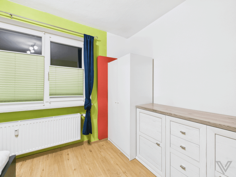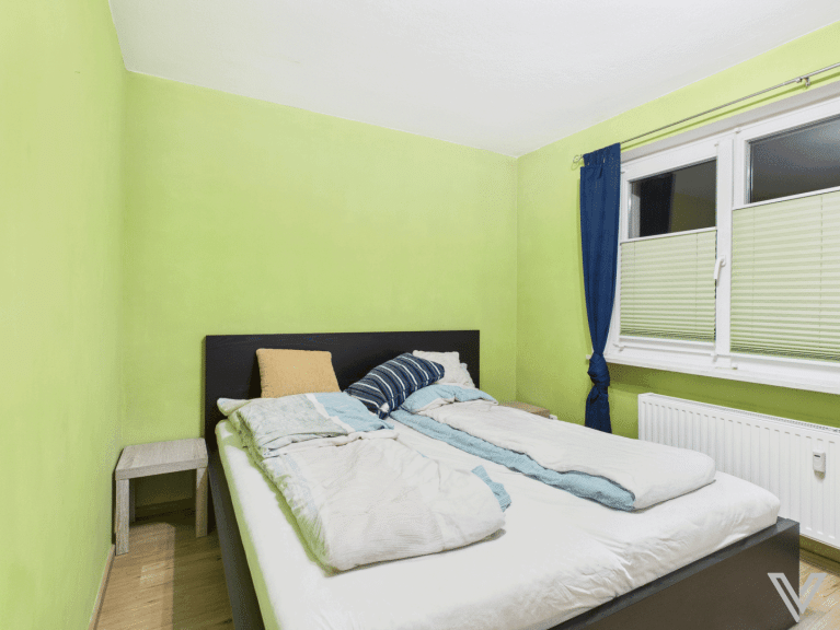 Einteilung: Wohnzimmer, Küche, Schlafzimmer, Vorraum, Bad (mit Wanne und WC), Loggia.