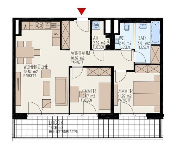 Die ca. 18,06m² große Loggia ist sowohl vom großzügigen Wohn-/Essbereich mit voll ausgestatteter DAN-Küche als auch von beiden gemütlichen Schlafzimmern aus begehbar. Das Badezimmer verfügt über ein Waschbecken und eine Badewanne. Die Toilette ist separat begehbar. Ein praktischer Abstellraum mit Waschmaschinenanschluss rundet das Angebot ab.