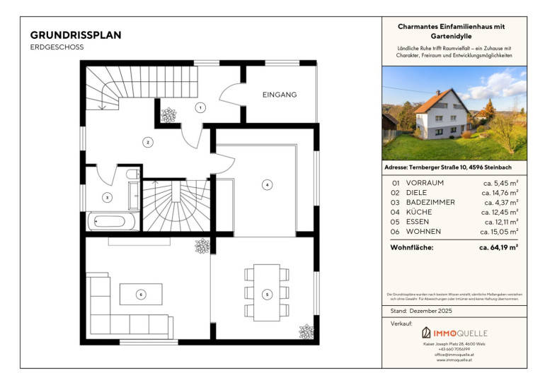 Im Erdgeschoss erwarten Sie ein einladender Eingangsbereich, ein zentraler Vorraum, eine voll ausgestattete Küche, ein gemütliches Wohnzimmer, ein weiteres Zimmer sowie ein Badezimmer mit WC.