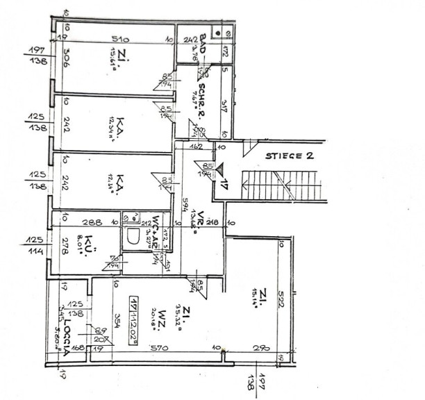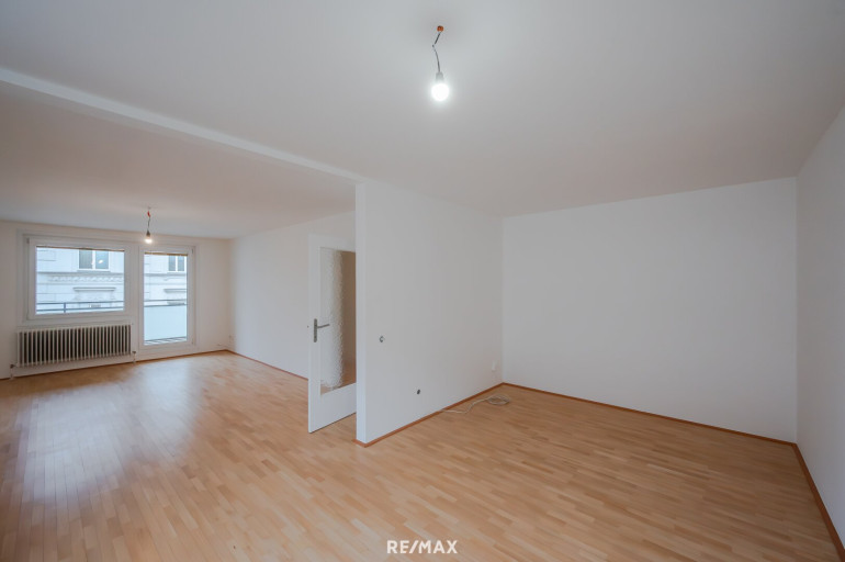 - Wohnzimmer mit Ausgang auf Loggia: ca. 35,32 m² (ursprünglich 2 Zimmer, derzeit zusammengelegt)