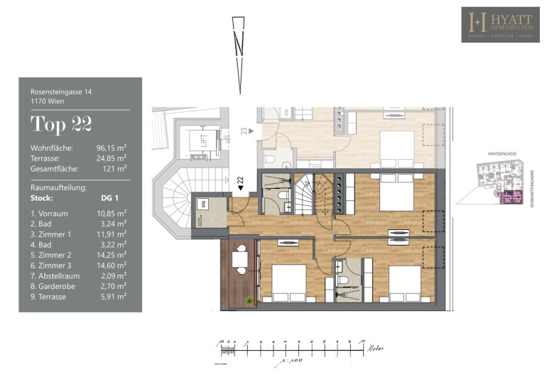 Mit einer Wohnfläche von 96,15 m² und einem durchdachten Raumkonzept erstreckt sich diese exquisite Immobilie über 4 lichtdurchflutete Zimmer. Der Erstbezug dieser Wohnung ermöglicht es Ihnen, in ein frisches, modernes Zuhause einzuziehen, das keine Wünsche offenlässt. Darüber hinaus verfügen Sie über zwei Terrassen mit insgesamt ca. 24,85 m² Freifläche.