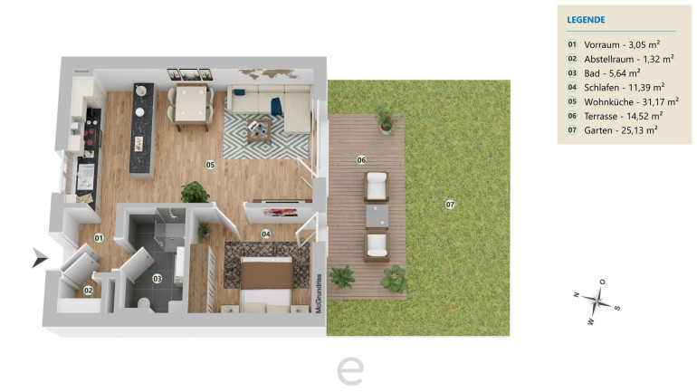 Das Herzstück ist der großzügige Wohn- und Essbereich mit offen integrierter Küche – ein Ort, an dem man gerne zusammenkommt. Von hier aus öffnet sich die südlich ausgerichtete Terrasse - sonnig, ruhig und mit Blick in die umliegende Natur. Ein Schlafzimmer mit Blick und Direktzugang in den Garten, ein modern ausgestattetes Badezimmer mit Dusche und WC und ein praktischer Abstellraum ergänzen den hohen Wohnkomfort.