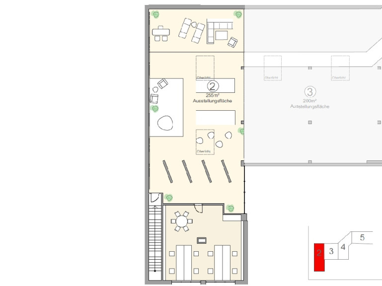 Durch die spielend leichte Flächenanpassung eignet sich die Fläche perfekt für Interior-, Design- und Bau(neben)gewerbeunternehmen, die ein professionelles Präsentationsumfeld suchen. Im Obergeschoss sind bereits Wasser- und Kanalanschlüsse vorbereitet. Die gesamte Fläche ist zudem mit Fußbodenheizung ausgestattet.