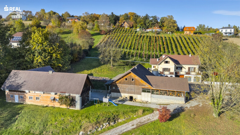 Die gesamte Liegenschaft umfasst eine Fläche von knapp 4,5 Hektar. Davon entfallen 24.247m² auf zwei Wald-Grundstücke und 8.651m² davon sind Weingärten (Welschriesling, Weißburgunder, Zweigelt - gesamte Jahresproduktion ca. 5-6.000 Liter). Der Rest sind die verbauten Flächen und diverse weitere landwirtschaftliche Flächen (Wiesen, verbuschte Flächen).
