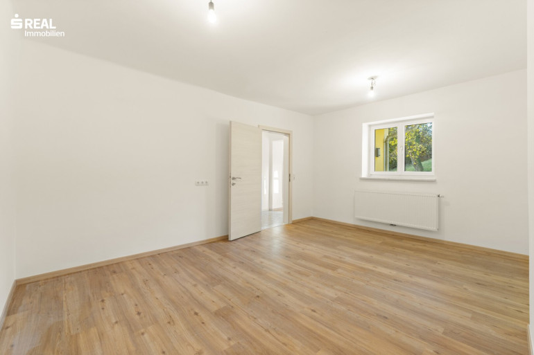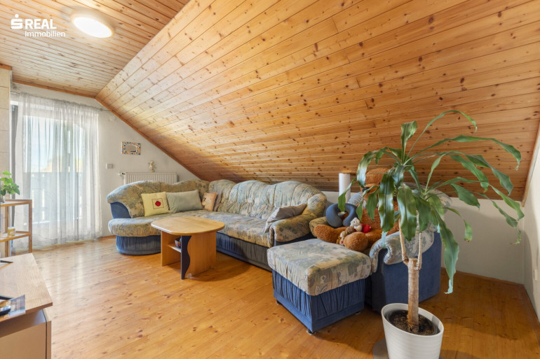 Die Einliegerwohnung bietet auf etwas über 70m² einen separaten Zugang mit einem großen Vorzimmer, von dem aus das WC und ein Abstellraum erreicht wird. Durch einen Flur gelangt man zum Badezimmer (mit Badewanne), zu einem großen Schlafzimmer und zur Küche mit der Möglichkeit einen Essbereich zu gestalten. Durch die Küche gelangt man wiederum zum gemütlichen Wohnzimmer. Der Rohdachboden ist vorbereitet für einen Ausbau.
