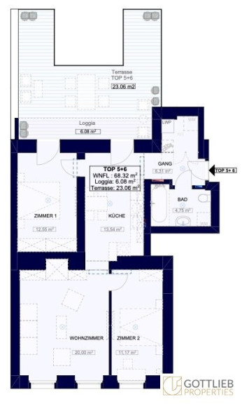 Über einen Vorraum gelangen Sie ins Badezimmer mit Badewanne und Toilette, in die geräumige Küche sowie ein Schlafzimmer. Diese Räume sind südseitig zum ruhig gelegenen Innenhof ausgerichtet und haben einen direkten Ausgang auf die ca. 6,00 m² große Loggia und die ca. 23,00 m² große Terrasse. Das Wohnzimmer mit ca. 20,00 m² und ein weiteres Schlafzimmer erreicht man über die Küche und komplettieren diese somit den Grundriss dieser sehr gut geschnittenen Altbauwohnung.