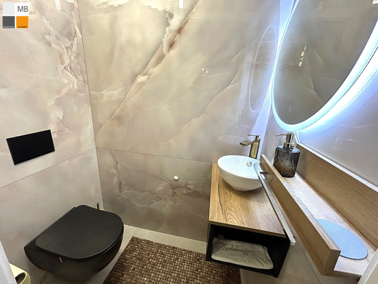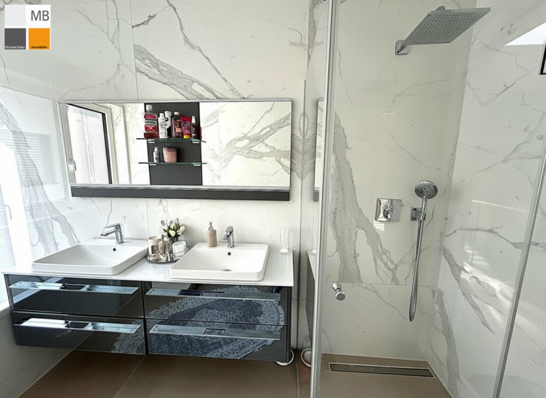 Two elegant bathrooms with bathtub, walk‑in shower, double washbasin and WC