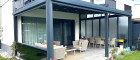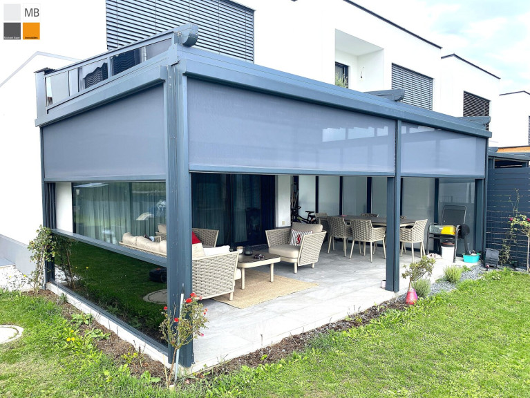 🌞 Wunderschöne Überdachung der Terrasse mit elektrischen Insektenschutzrollos und Sichtschutz zu den Nachbarn!