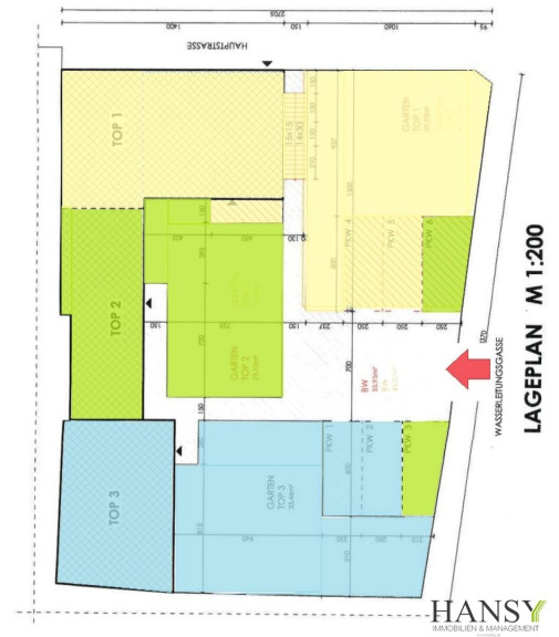 6 Abstellplätze auf Eigengrund stehen zu Verfügung wie auch jedes Haus davor über eine kleine Gartenfläche verfügt.