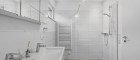 Das Tageslichtbadezimmer überzeugt mit einer großzügigen begehbaren Dusche sowie einer Badewanne. Ergänzt wird der ideale Grundriss durch ein separates Gäste WC.