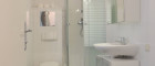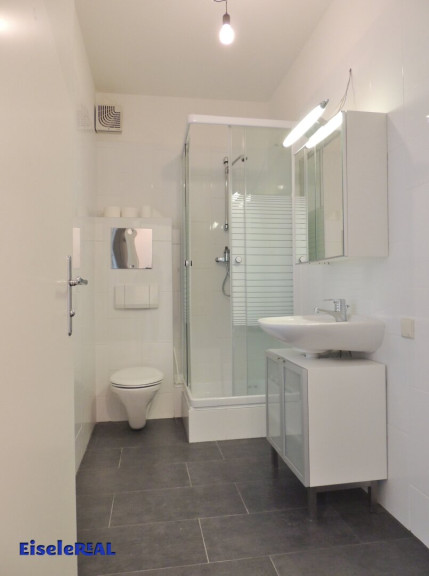 - Badezimmer mit Dusche, Waschbecken, Waschmaschinenanschluss und WC