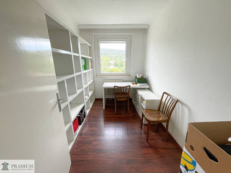 Mit dem Lift hinauf und dann über Treppen in den obersten Stock gelangt man in die Wohnung. Der Vorraum macht alle Zimmer zentral begehbar, beginnend mit der Küche auf der linken Seite. Rechter Hand findet man das WC und dann das Badezimmer mit Badewanne. Ein Home-Office oder Kinderzimmer ist das erste der insgesamt 3 Zimmer. Das Schlafzimmer befindet sich am Ende der Wohnung, bietet ausreichend Platz für ein Doppelbett sowie einen großen Kleiderschrank.