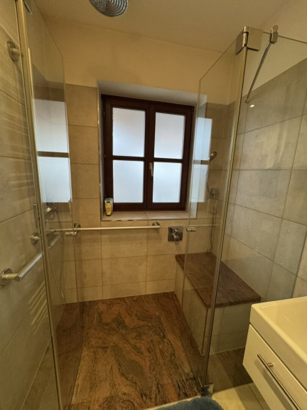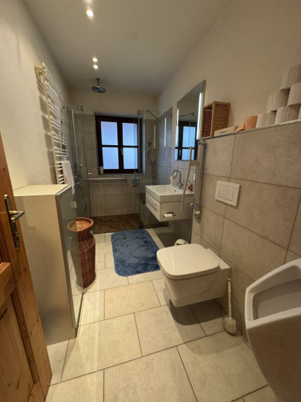 - Badezimmer: Badezimmer mit ebenerdiger Dusche, WC, Pissoir und Fenster, das Tageslicht hereinlässt.