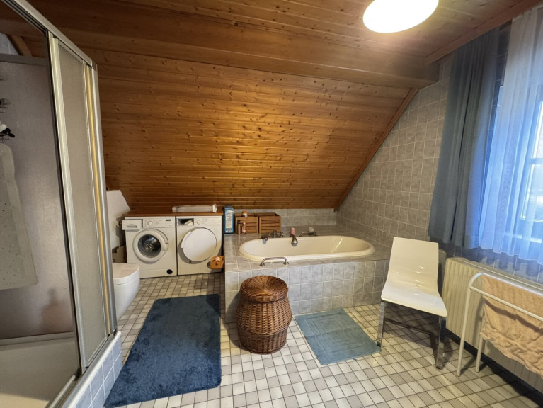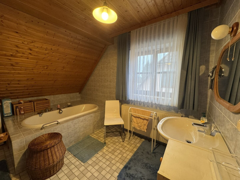 - Badezimmer: Großzügiges Badezimmer mit Badewanne, Dusche, WC und Fenster.