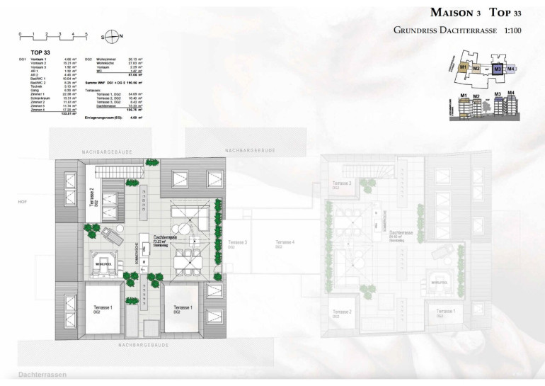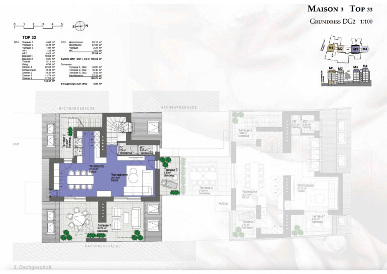 2. Dachgeschoss: Wohnküche (27,03 m²), Wohnzimmer (26,13 m²) mit Zugang zu 3 Terrassen (53,51 m²), Vorraum und Gäste-WC