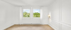 Der Wohnbereich zeigt sich mit warmem Fischgrätparkett, hohen weißen Wandpaneelen und bodenhohen Vorhängen, die das weiche Tageslicht der Südausrichtung einfangen. Die großen Fensterfronten blicken direkt ins Grüne – der Blick zieht über die Baumkronen hinweg und schafft eine Ruhe, die man sonst nur in Villenlagen findet.