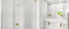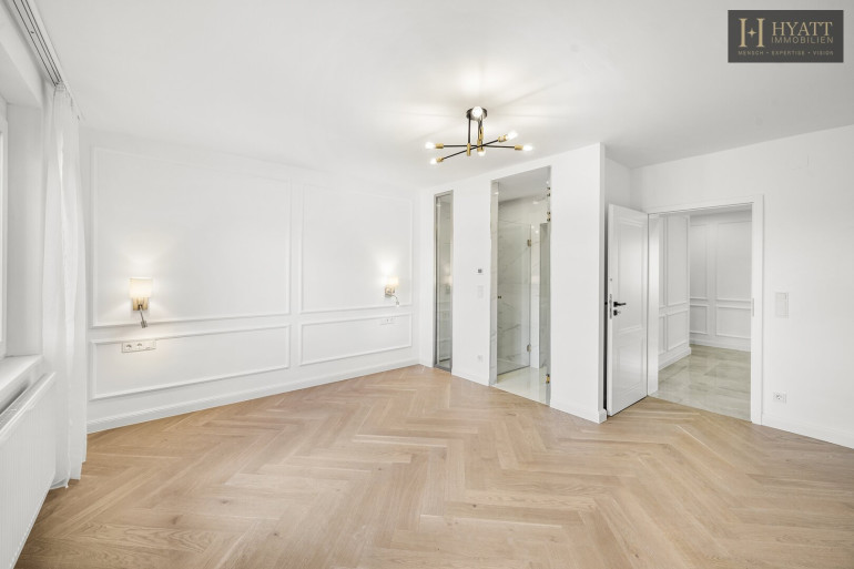 Die Wohnung bietet derzeit zwei Schlafzimmer, darunter eine Master-Suite, die mit ihrem eigenen Badezimmer samt Walk-In Dusche, großem Spiegelkonzept, hochwertigen Armaturen in Gold und einer rundum eleganten Marmoroptik beeindruckt. Dieses Bad wirkt wie ein Boutique-Hotel – luxuriös, clean und absolut zeitlos.