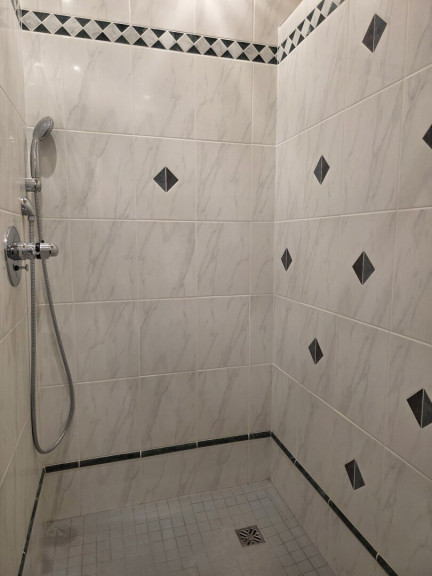 - Badezimmer mit Dusche, Waschmaschine und Trockner