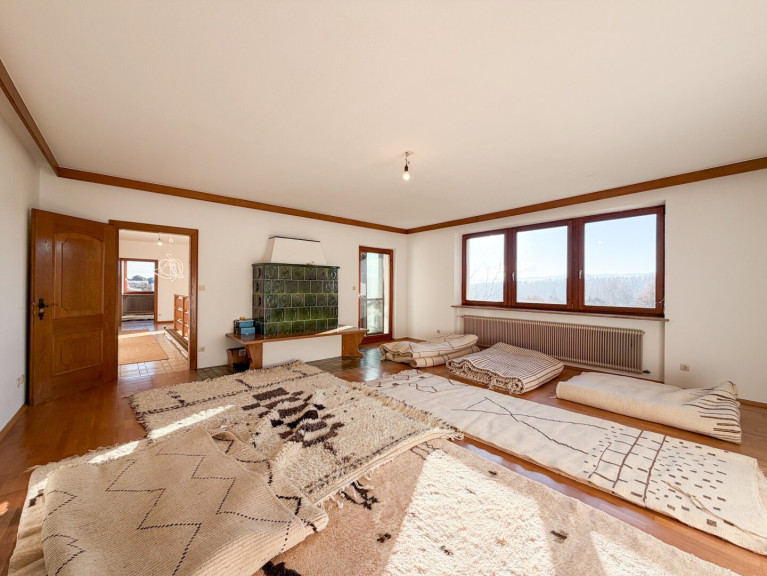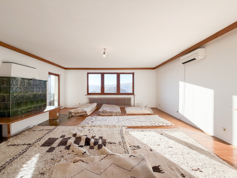 Als absolutes Highlight und Alleinstellungsmerkmal muss der unverbaubare Panoramablick erwähnt werden. Sie werden die Sonnenuntergänge mit Ihrer Familie beim gemeinsamen Abendessen auf der rd. 27m² großen Loggia genießen. Ein offener Kamin und der gemütliche Ofen im großen Wohnzimmer garantieren in Kombination mit dem traumhaften Ausblick ein Wohngefühl der Extraklasse.