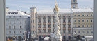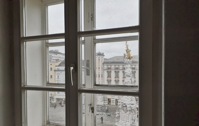 Mit direkten Blick auf die Dreifaltigkeitssäule am Linzer Hauptplatz bieten die Wohnräume eine außergewöhnliche Aussicht. Eine voll ausgestattete Küche und ein Badezimmer mit Dusche und Badewanne runden das Angebot ab. Zusätzlich gibt es ein separates Gäste-WC.