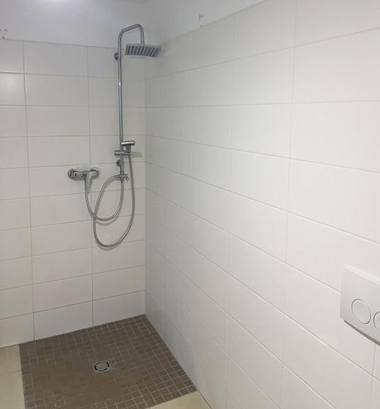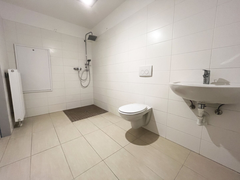 Das Badezimmer ist modern verfliest und mit einer bodenebenen Dusche, einem Handwaschbecken sowie einem Anschluss für die Waschmaschine ausgestattet. Das WC ist separat angelegt.