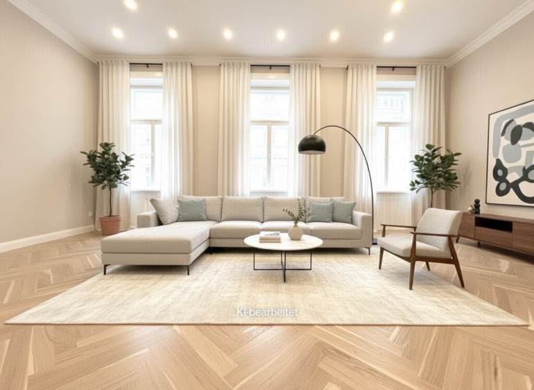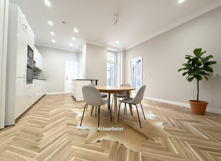 FYI: Die Wohnung ist unmöbliert, bis auf die Einbauküche und die Bäder. Die möblierten Fotos sind mit KI bearbeitet.