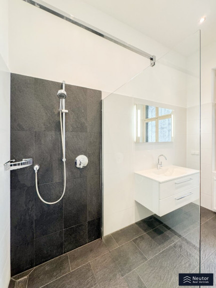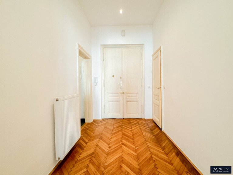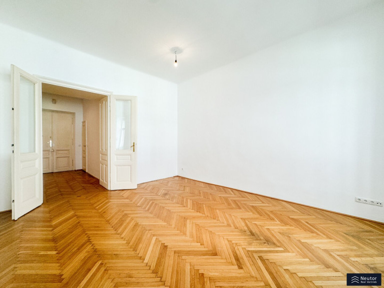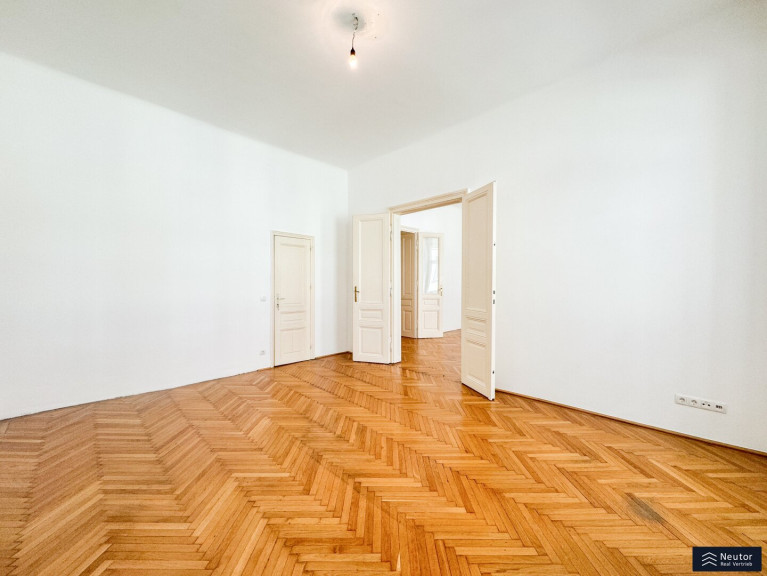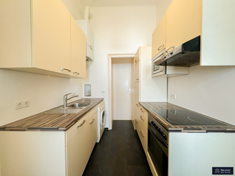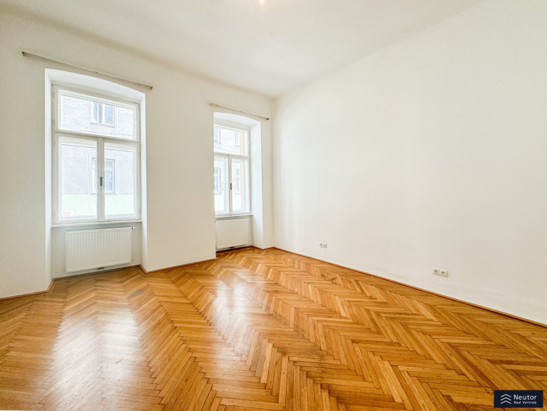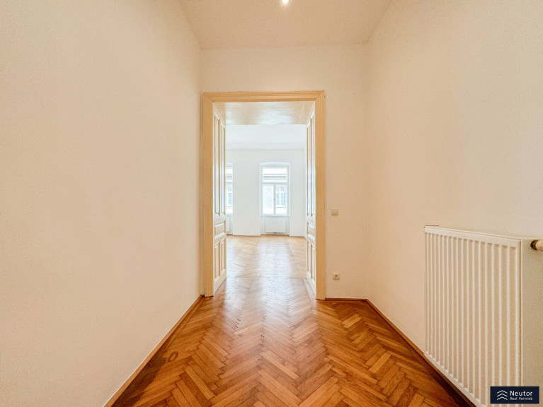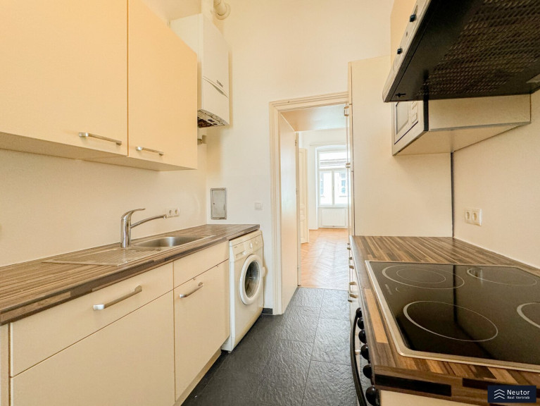 Im Herzen von Mariahilf, nur wenige Schritte von der Mariahilfer Straße und dem Haus des Meeres entfernt, präsentiert sich dieses stilvolle Altbaujuwel als perfekte Symbiose aus klassischer Wiener Wohnkultur und zeitgemäßem Wohnkomfort. Bereits beim Eintreten empfängt Sie ein äußerst großzügig gestalteter Vorraum, der mit seiner Weitläufigkeit und den exzellenten Stauraummöglichkeiten den eleganten Charakter der Wohnung unterstreicht. Hier beginnt das Gefühl von Großzügigkeit, das sich durch die gesamte Immobilie zieht. Zur Linken des Eingangsbereichs befindet sich das separat gelegene WC, welches mit einem eigenen Handwaschbecken ausgestattet ist – ein diskretes Detail, das Komfort und Funktionalität ideal verbindet. Rechter Hand gelangt man in die separate Küche, die nicht nur durch ihre vollständige Ausstattung überzeugt, sondern auch durch ein Fenster mit Blick in das ruhige Stiegenhaus. Der Küchenbereich bietet ausreichend Platz zum Kochen und Verweilen und ist der ideale Ort für Genuss und Gastlichkeit. Direkt an die Küche anschließend eröffnet sich das stilvolle Badezimmer, das mit einer hochwertigen Dusche, einem eleganten Waschtisch sowie einem weiteren Fenster ins Stiegenhaus ausgestattet ist. Dadurch wird nicht nur für optimale Belüftung gesorgt, sondern auch für angenehmes, natürliches Tageslicht – ein echtes Highlight unter den Altbau-Badezimmern. Das Herzstück der Wohnung bildet zweifellos das großzügige Wohnzimmer. Lichtdurchflutet durch klassische Kastenstockfenster und verbunden durch originale Flügeltüren, vermittelt dieser Raum ein Gefühl von Weite und Behaglichkeit. Die hohen Decken und der gepflegte Parkettboden verstärken den typischen Altbau-Charme, der in dieser Wohnung stilvoll in Szene gesetzt wird. Das Schlafzimmer, das sowohl über das Wohnzimmer als auch direkt von der Küche aus zugänglich ist, schafft einen angenehmen Rückzugsort mit wohnlicher Atmosphäre. Auch hier setzt sich der hochwertige Parkettboden fort und unterstreicht den stimmigen Gesamteindruck der Immobilie.
