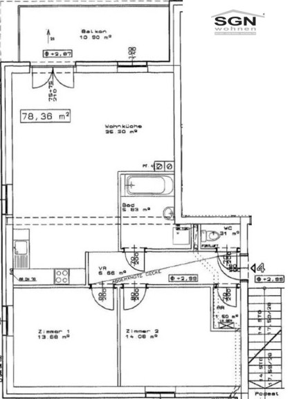 Die geförderte, lichtdurchflutete Wohnung im 1.OG gliedert sich in eine Wohnküche mit Küchenanschlüssen, zwei Schlafzimmer, einen inneren Abstellraum, einen Vorraum, ein separates WC und einen Badezimmer mit Badewanne. Der Balkon ist Richtung Westen ausgelegt.
