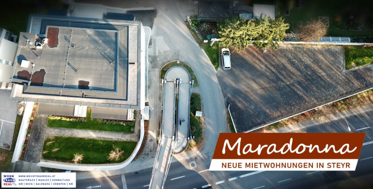 Gelegen im Stadtteil Münichholz in 4400 Steyr, bietet der Standort eine exzellente Straßen- und öffentliche Verkehrsanbindung (Haager Straße, Regional- und S-Bahnhof "Steyr Münichholz". Die in unmittelbarer Nähe gelegene Enns (Fluss) und das angrenzende Münichholz sind ein schönes Naherholungsgebiet und ideal für Spaziergänge und Entspannung am Ennsufer. Weitere Sport- und Freizeitmöglichkeiten bieten das angrenzend Stadtbad Steyr, sowie ein ganzes Sportzentrum direkt an der gegenüberliegenden Uferseite (Tennis, Fußball, Kunsteisbahn, Leichtathletikanlage u.v.m.) Steyr ist ein starker Wirtschaftsstandort, besonders im automotiven und technischen Bereich. Der Wohnpark Maradonna ist direkt angrenzend an die Firmen BMW Werke Steyr, SKF, Elektro Kammerhofer, Steyr Automotive und einige mehr. Für Mitarbeiter dieser Standorte also ein idealer Wohnort. Kindergarten, Volksschule und die HTL Steyr befinden sich ebenfalls jeweils 5-10 Gehminuten entfernt. Natürlich ist auch für jegliche weitere notwendige Infrastruktur (Einkaufen, Ärztezentren, Restaurants und Bars, etc.) in Steyr bestens gesorgt.