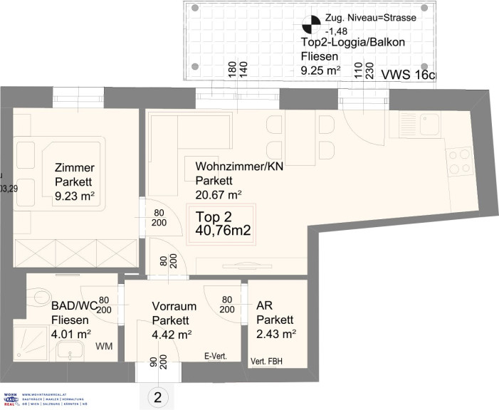 Die 2-Zimmer Wohnung besteht aus einem großen Wohn-Essbereich mit eingebauter Küche und einem Schlafzimmer. Die Wohnfläche mit knapp 41 m² ist für Paare perfekt ausreichend. Hier kommt noch ein Balkonvon 9,25 m² hinzu, ein Abstellraum von 2,43 m² und eigenes Kellerabteil mit 2,23 m² ist ebenfalls mit dabei.