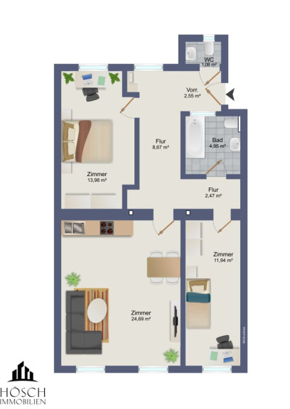 Das Wohnzimmer bildet das Herzstück der Wohnung und lädt zu entspannten Stunden mit Familie und Freunden ein. Die großzügige Wohnküche ist ideal für gemeinsame Kochabende, während die Schlafzimmer ruhige Rückzugsorte bieten. Ein praktischer Abstellraum sorgt für zusätzlichen Stauraum, und das separate WC sowie das moderne Badezimmer mit eleganten Armaturen erhöhen den Wohnkomfort.