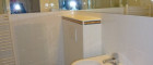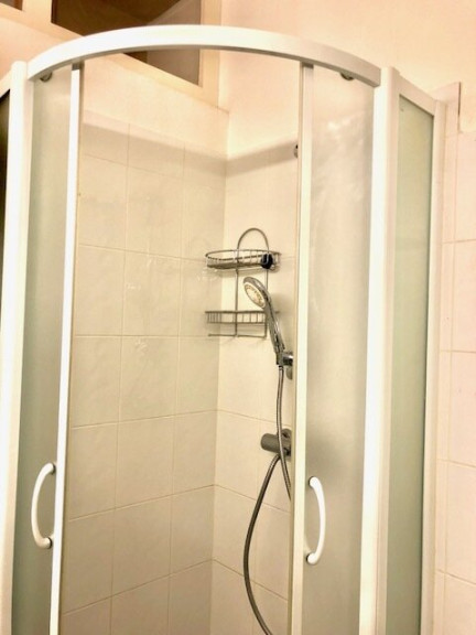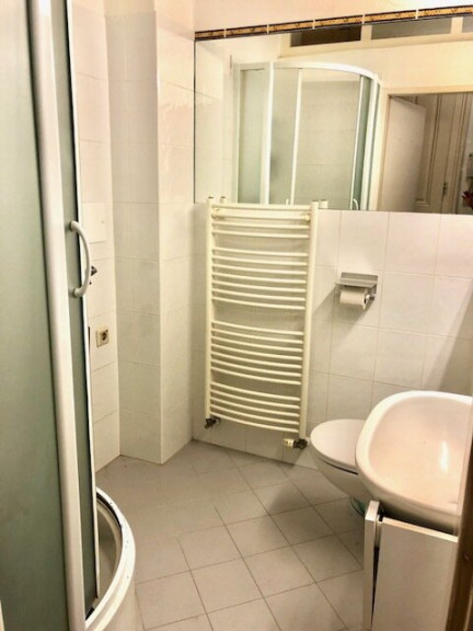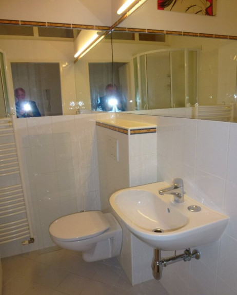 - Bad mit großzügige Eck-Dusche, Handwaschtisch mit Wand-Spiegel, WC, Waschmaschinen-Anschluss, Heizungshandtuchhalter;