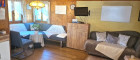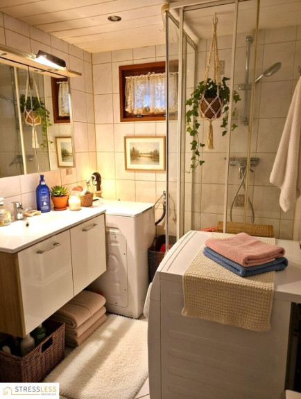 Das Erdgeschoß vereint gemütliches Wohnen, Essen und eine komplett ausgestattete Küche. Das daneben angeordnete Bad bietet Handwaschbecken, Dusche, Fenster und Waschmaschinenanschluß. Unter dem Stiegenaufgang befindet sich ausreichend Stauraum für Vorräte.