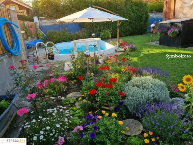 Draußen ist das neue Drinnen: Ein eigener Pool, eine gemütliche, überdachte Sitzecke, ein geselliger Grillplatz und zwei Abstellräume für Fahrräder und Co. lassen keine Wünsche offen.