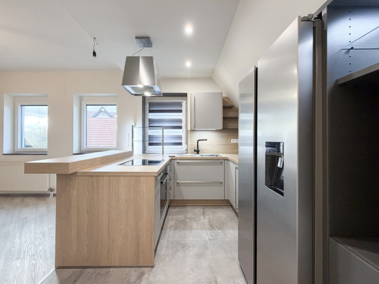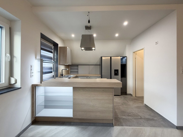 Fliesen, Kunststoffboden, Zentralheizung, Fußbodenheizung, Einbauküche, Wohnküche / offene Küche, Bad mit Fenster, Dusche, Garage, Parkplatz