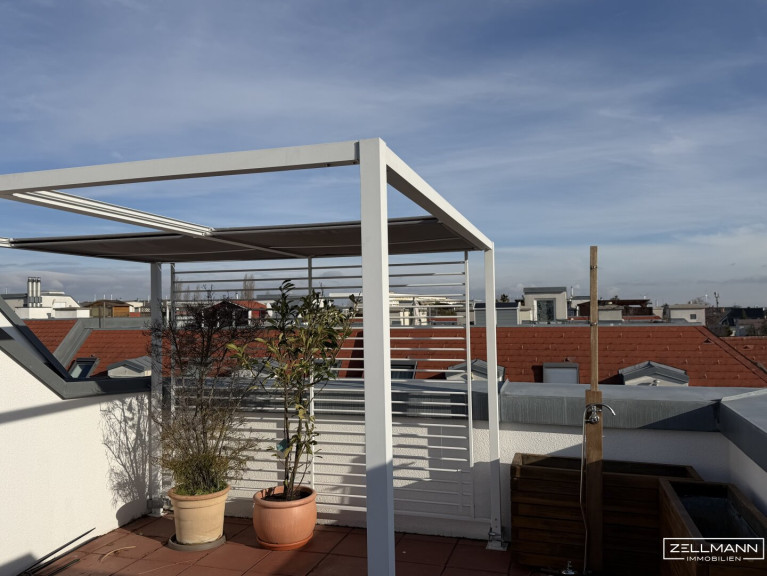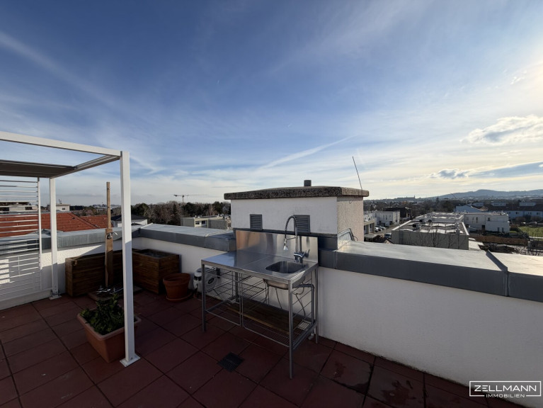 Sie ist über das Stiegenhaus erreichbar und ausgestattet mit Pergola, Outdoor-Dusche, Außenküche und liebevoller Bepflanzung – ein persönliches Refugium, das zum Entspannen, Genießen und Verweilen einlädt.
