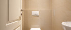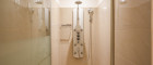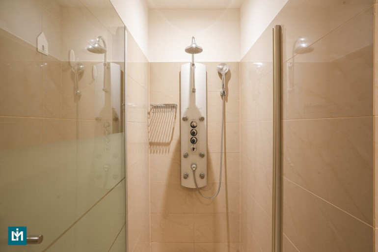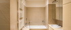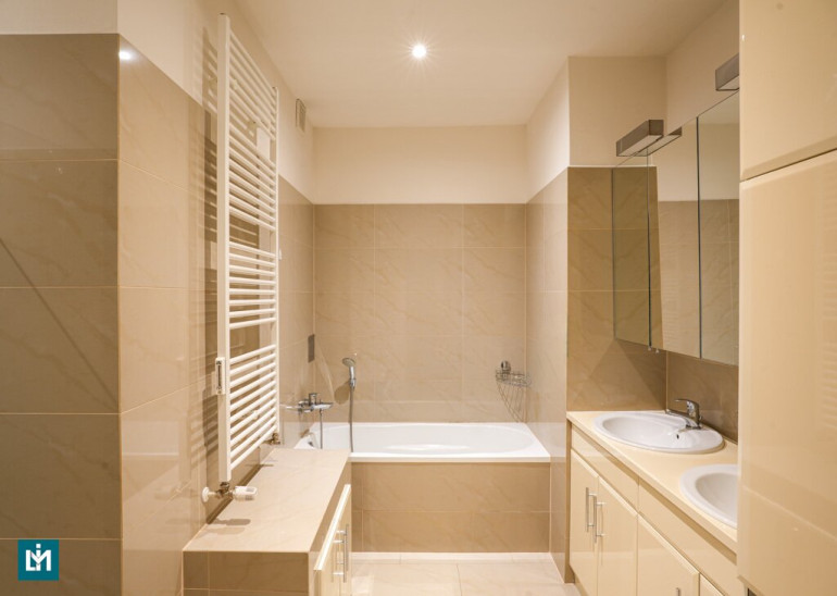 - Badezimmer mit Dusche, Wanne, Doppelwaschbecken, Sprossenheizung und Waschmaschinenanschluss