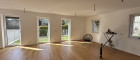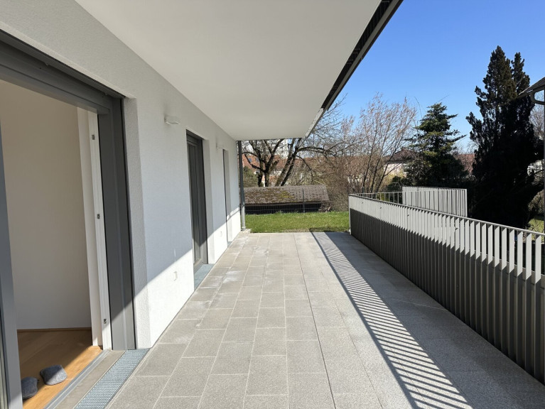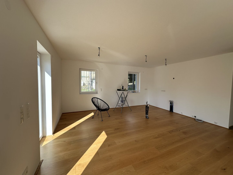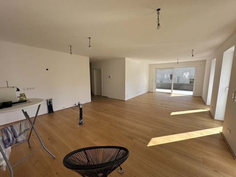 Das Herzstück der Wohnung ist zweifelsohne der offene, ca. 44,4 m² große Wohnbereich, der Kochen, Essen und Wohlfühlen vereint. Durch die Hebeschiebetüre gelangen Sie von hier aus auf die 37,20 m² große Terrasse und den Eigengarten.