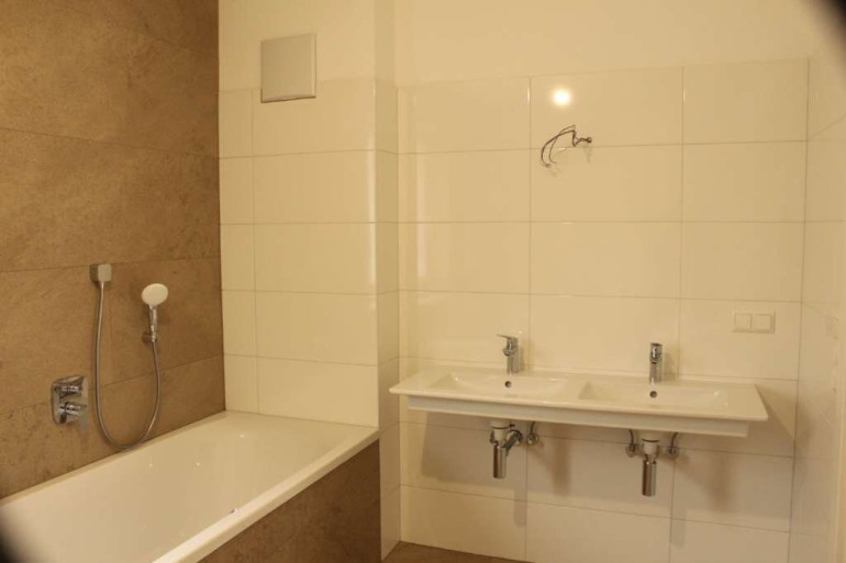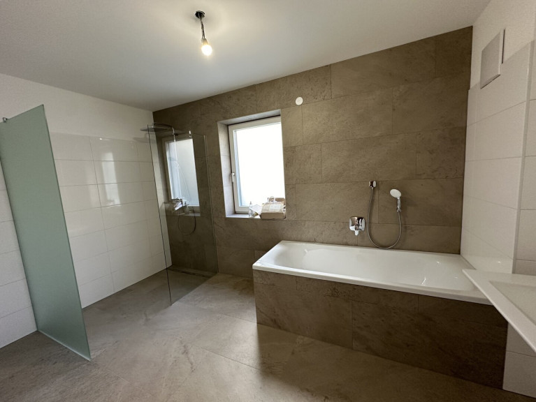 Die Tageslicht-Wellnessbad ist ca. 10 m² groß und lässt mit barrierefreier Dusche, Badewanne, einem Doppelwaschtisch in Premium-Ausführung und einem Waschmaschinenanschluss keine Wünsche offen.