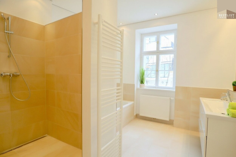Das erste der beiden Badezimmer ist vom Vorzimmer aus begehbar, verfügt über eine Walk-In Dusche und ein WC und ist in harmonischen Beige-Tönen gehalten - Topmodern und gleichzeitig sehr stilvoll!
